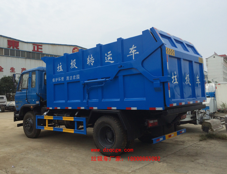 卸料結(jié)構(gòu):系用箱卸料,由兩只液壓油缸直接舉升車(chē)廂進(jìn)行卸料,箱底與地面夾角不小于45度,以實(shí)現(xiàn)垃圾依靠自重能自行卸下的專(zhuān)用自卸運(yùn)輸車(chē)。