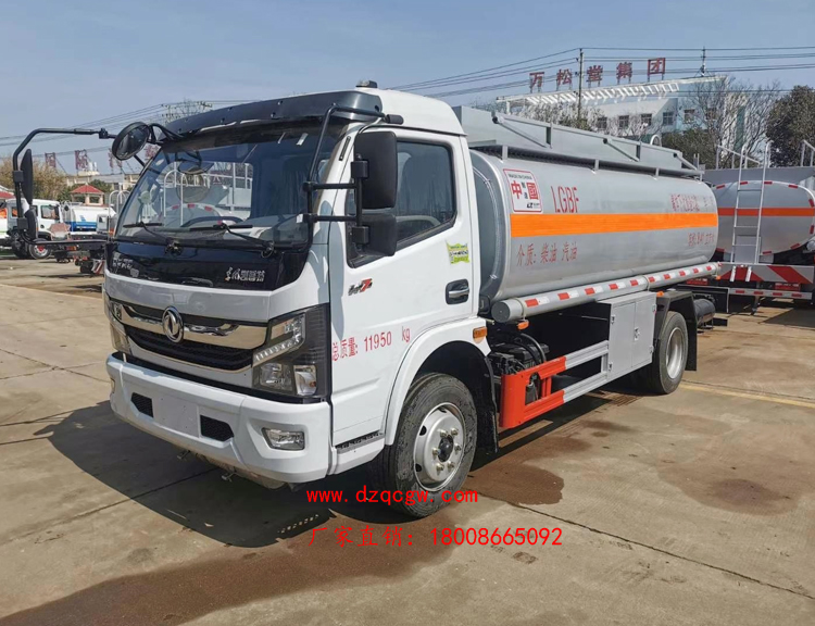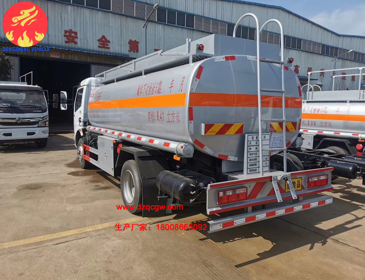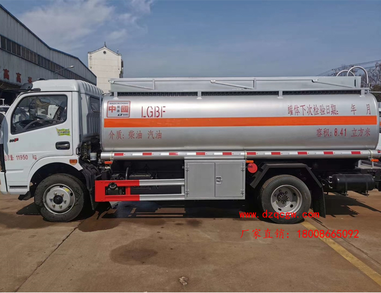 罐體容積10.3m3,罐體采用4.2mmQ235B鋼板制作,壹個鋁合金歐式罐口,專用油泵,可自吸自排,泵的出口在右邊,一個鋁合金海底閥(加裝聲光報警),正星大流量加油機及15米卷盤,加油機下掛至正駕一側(cè)。一套油氣回收裝置,一套防溢漏報警裝置,一個下裝口,一個靜電線盤,罐頂升降護欄。一個工具箱,一個防火帽,帶堵蓋,炮筒,配4KG滅火器。罐體先噴底漆再裝車,所有管道裝車時刷防銹漆,罐體金屬銀灰漆,貼反光線條及3號危險品標。