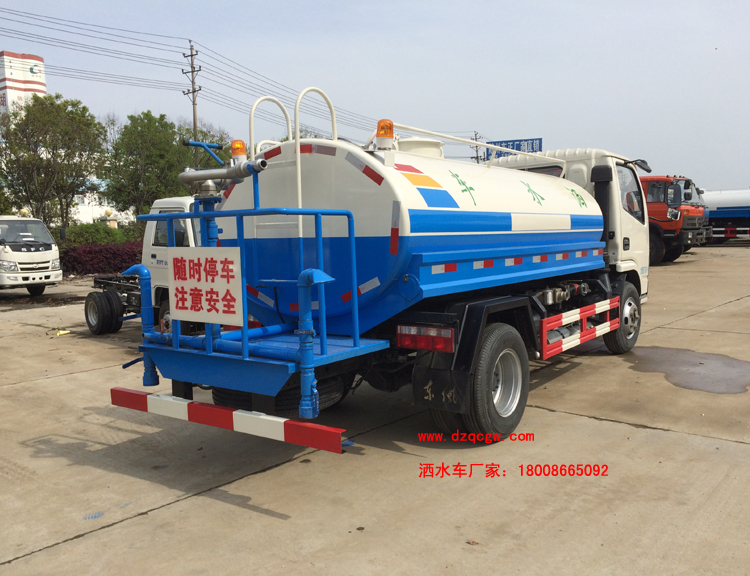 底盤說明:東風(fēng)小多利卡單排駕駛室,3308mm軸距,國五朝柴102馬力或玉柴115馬力發(fā)動機(jī),萬里揚5檔變速箱,7.00R16鋼絲胎,方向助力,ABS,駱駝電瓶,中控鎖,電動門窗。罐體有效容積:1.57立方米。 專用功能:該多功能灑水車適合于各種路面的灑水、噴霧、降溫、除塵、沖洗塵埃臟物,亦可用于園林綠化、市政環(huán)衛(wèi)、路面養(yǎng)護(hù)及應(yīng)急消防、運輸飲用水等。專用部分由罐體、水泵、球閥、輸水管道、灑水裝置等部件組成。水泵、取力箱、球閥均為國家定型產(chǎn)品,具有性能良好,工作可靠、壓力高、流量大、油耗低等特點。 改裝部分:標(biāo)配前沖、后灑、側(cè)噴、工作平臺、綠化高炮、自流閥、消防接口,輸水管3米2根,8噸以上罐體帶高位花灑2個,億豐泵或金龍泵,控制方式為手動。選裝氣動閥門控制;高位花灑,大鴨嘴,藥盤,罐體側(cè)面加裝萬向可調(diào)節(jié)噴頭,罐體后部壓塵噴灑裝置,兩個圓警燈或長警燈,LED箭頭燈,泵可選裝威龍泵或農(nóng)藥噴霧裝置。 |